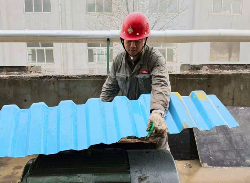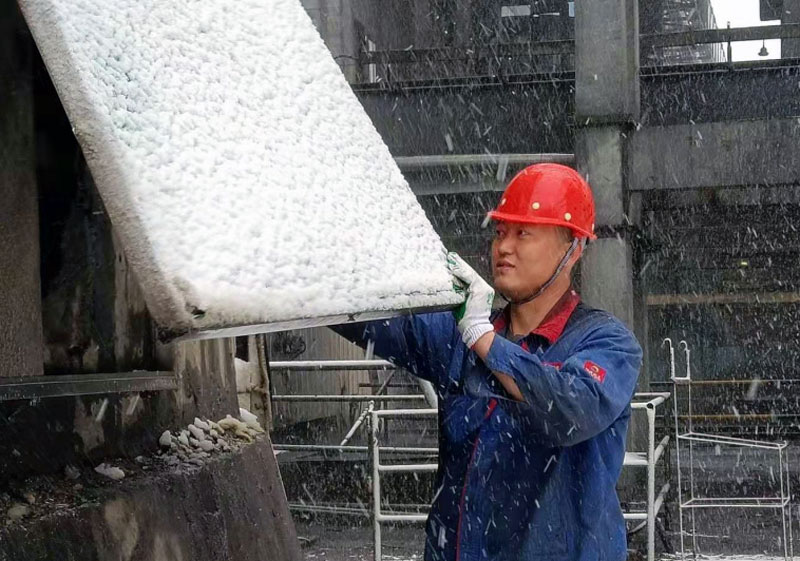 忙着为室外设备遮风挡雨,却忘了衣服已被雪浸湿。恒坤化工保运车间生产班长马亮正在为室外设备敷设遮雪板,保障安全生产。(焦统莉)