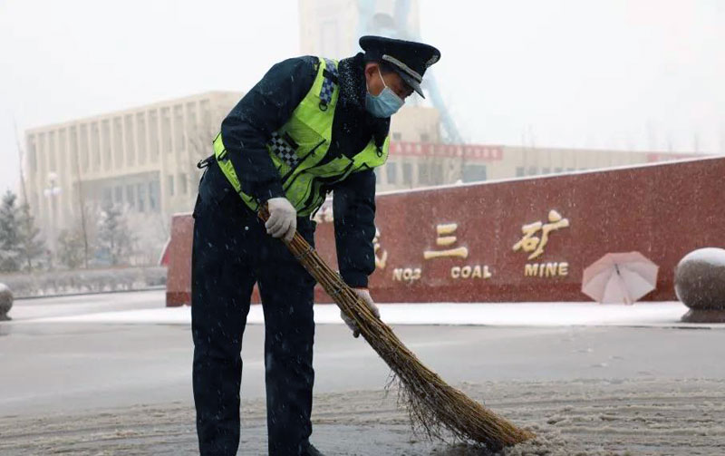 雪景美,坚守在工作岗位上创业者们更美!长城三矿保卫人员不畏严寒,正在加紧清理积雪,保障矿区道路安全通畅。(李莹)