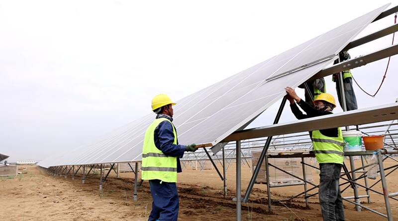 (光伏项目施工现场工人加紧安装光伏板)