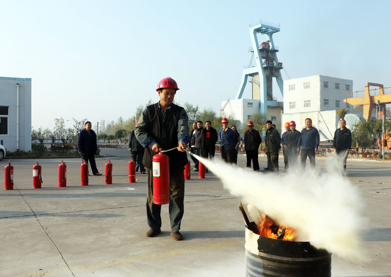 鄂庄煤矿工作人员讲解灭火器使用方法,并进行现场演练。(孔敏 摄)