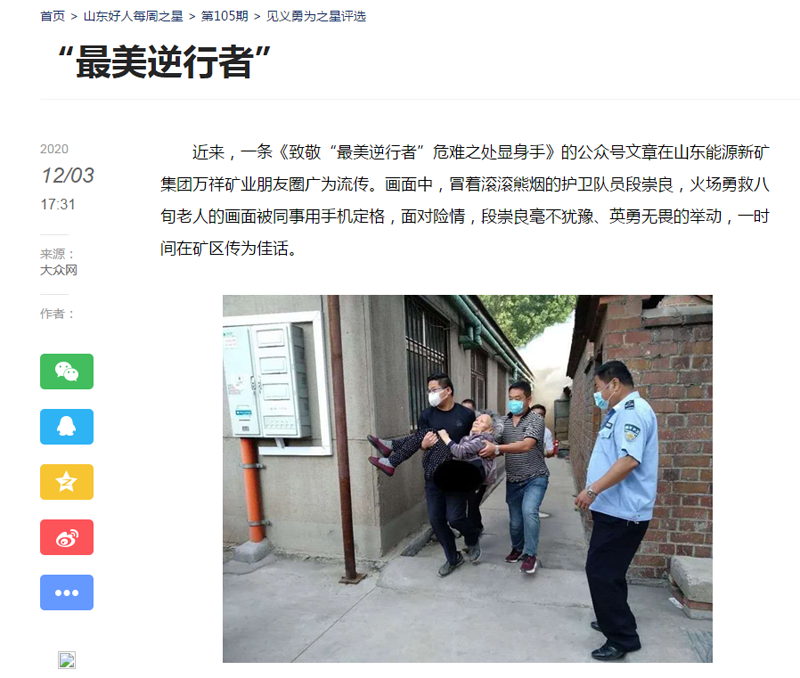 近日,一条《致敬“最美逆行者” 危难之处显身手》的公众号文章在万祥矿业朋友圈广为流传。冒着滚滚浓烟的护卫队员段崇良火场勇救八旬老人的画面被同事用手机定格。面对险情,护卫队员段崇良和同事毫不犹豫英勇无畏,一时间在矿区传为佳话。