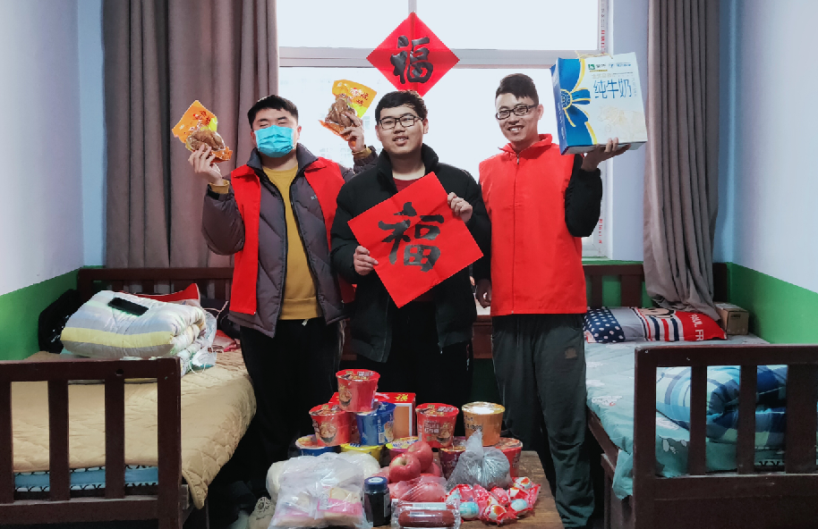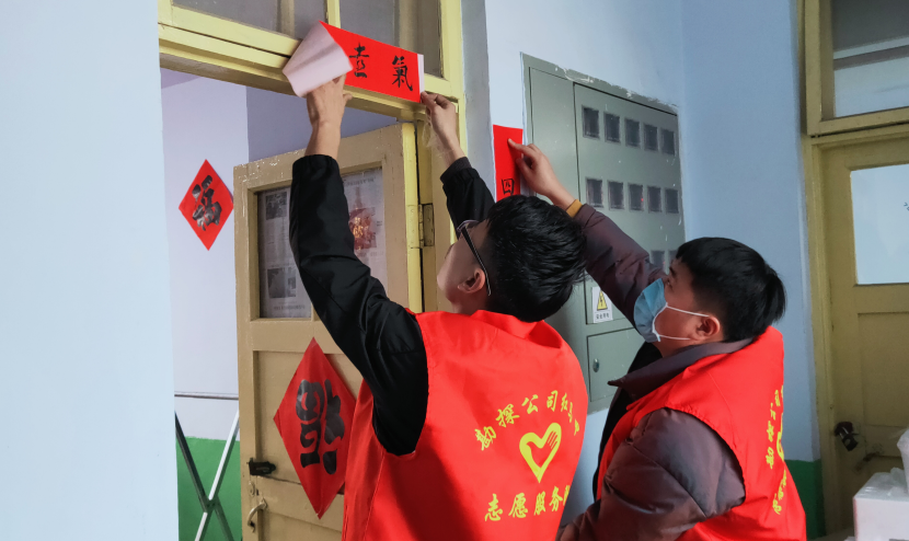除夕到,红红火火过大年。大年三十上午,为了让因疫情不能回家的吉林大学生张鑫度过一个幸福满满的春节,勘探公司“红马甲”志愿者开始忙活起来,收拾宿舍、擦窗户、贴对联、挂灯笼……志愿者们忙得不亦乐乎。