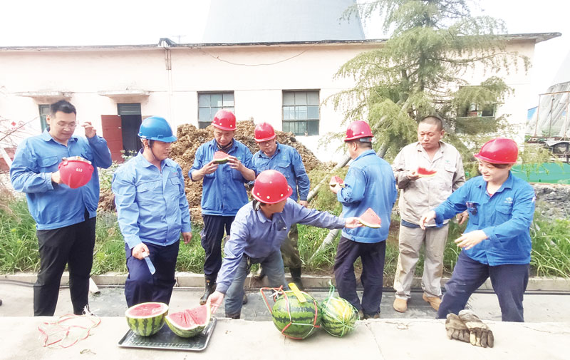 华丰顶峰热电公司为坚守生产一线的检修职工送去“清凉”和关怀,叮嘱他们高温天气注意安全作业。