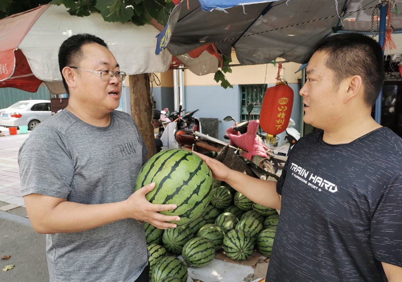 上午8:30,笔者跟随工会干事吴国栋骑着电动三轮车来到集市一起采购西瓜,每到一个瓜摊前,他都会熟练地敲击西瓜,询问价格,然后全集比价,优中选优。