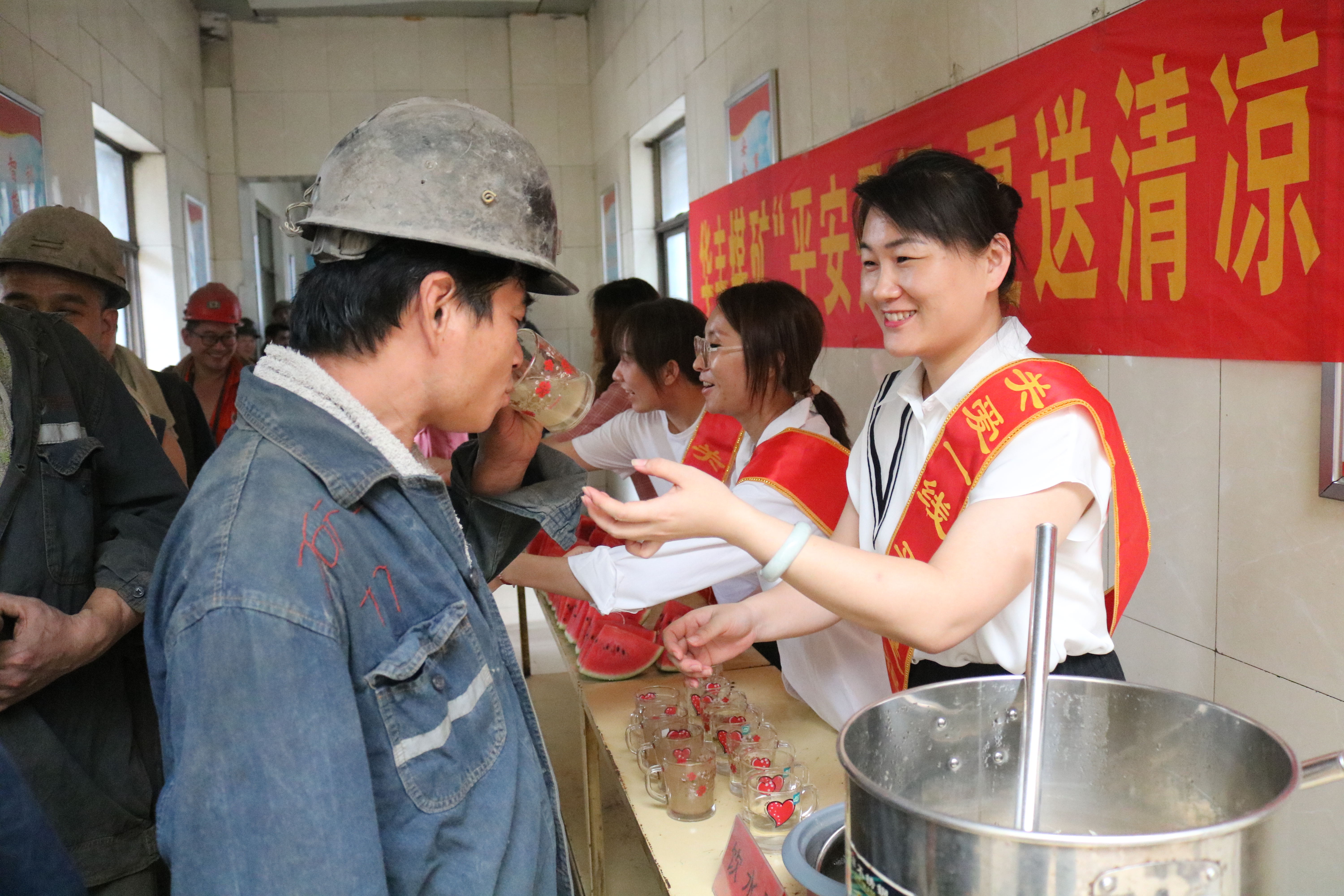 “来师傅,吃块西瓜再下井,清凉又解暑。”“伙计们,‘娘家人’又来给咱们送‘清凉’了,快来谢谢她们。”热情的服务伴随着职工们的欢声笑语在整个井口久久回荡。