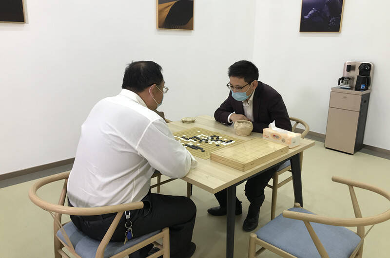 (职工在棋牌室切磋棋艺)