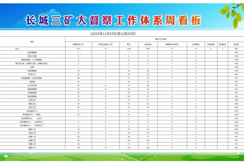 内部大督察工作体系,着力激发内生动力活力,不仅破解了管理中的难点堵点问题,更推动矿井从“就事督事”向“督管理、督履职、督作风”三维深度延伸,高质量发展势头向好。督查体系建立后,该矿重点工作完成率稳步提升,单周三大核心部门安排工作完成率达98%,矿井上下形成了“比学赶超”的浓厚氛围。