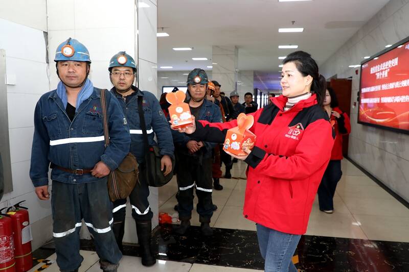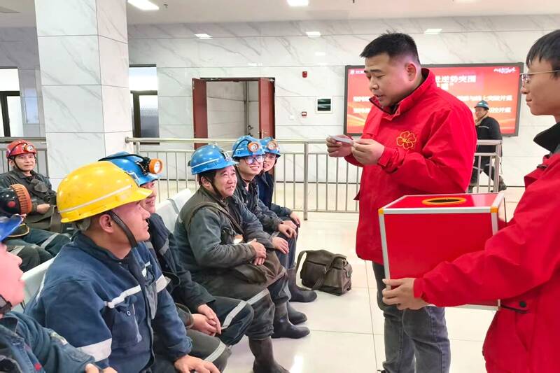 除知识问答外,“平安服务小队”还为即将下井的职工准备了寓意“平安顺遂”的苹果作为“平安礼”。职工准备下井时,“平安服务小队”成员主动递上苹果并轻声叮嘱:“师傅,拿好平安果,下井严格按规程操作,一定平平安安返岗!”暖心话语与平安祝福,为职工筑牢坚实的心理安全防线。