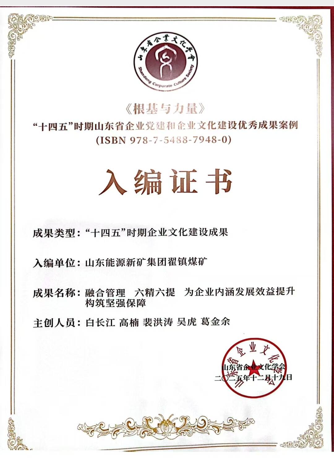 在山东省企业文化学会组织的专业评选中,翟镇煤矿凭借企业文化建设的系统性推进和创新性实践,荣获“十四五”时期山东省企业党建品牌创建示范单位;该矿党委副书记、矿长白长江荣获“十四五”时期山东省企业文化建设贡献人物,精心打造的企业党建品牌与深耕多年形成的优秀企业文化成果《融合管理 六精六提 为企业内涵发展效益提升构筑坚强保障》入选《根基与力量》“十四五”时期企业文化建设成果典籍案例。